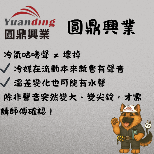 🔹 冷媒流動聲:冷氣壓縮機運轉時,冷媒會在管線內快速流動,產生像水泡或水聲般的聲音,屬正常現象。